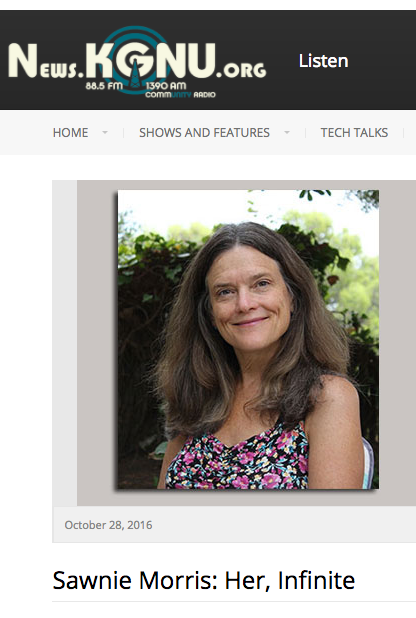 Interview with Sawnie Morris, conducted by Nikki Kayser on Metro Arts, KGNU radio, Boulder, Colorado. October 28, 2016.
