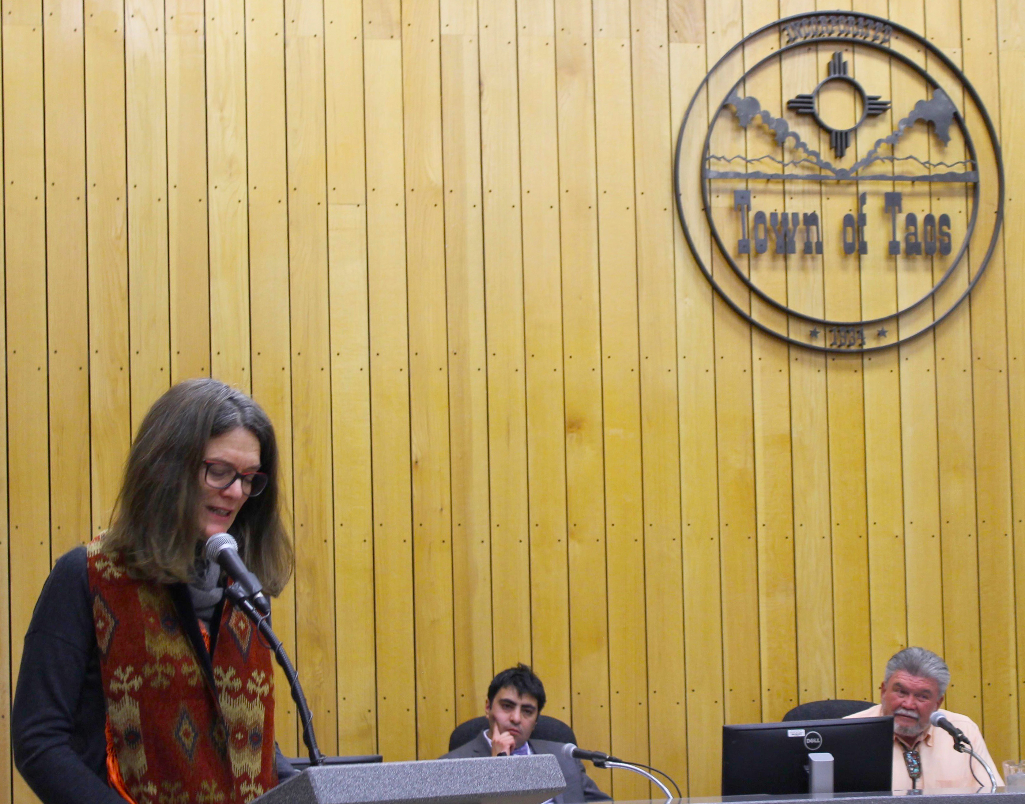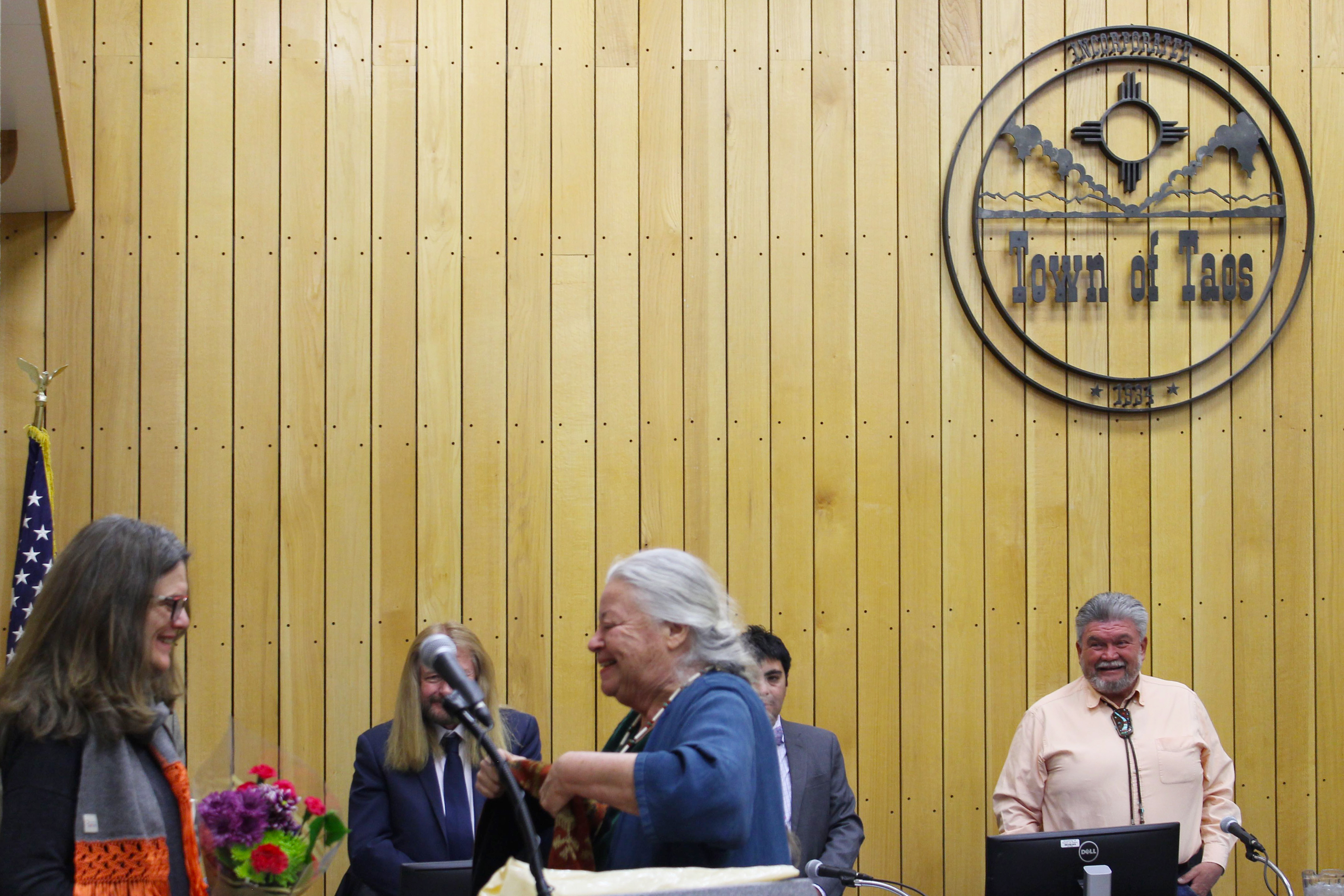 With gratitude to everyone who attended the ceremony introducing the Inaugural Poet Laureate of Taos before the Town Council, January 23, 2018, and who listened with such presence and attention while I read my poem, “How the Woman Becomes the Bear,” written in a café in Taos in my twenties, and dedicated to my sisters. I was honored to share the stage with two teenage Taos scientists and a host of town employees, all of whom were also being recognized – and so grateful to the very wonderful Jan Smith of SOMOS and the legendary Gail Russell, who wove the Poet Laureate vestment, as well as to the Council Members – and, in particular, to Council Member Hahn, who asked if I would be willing to return to say a few words and perhaps read a poem at the start of future Town Council meetings, especially when those meetings promise to be of a more contentious nature (though not taking sides). And so the job begins & in such a profound way! Poetry!